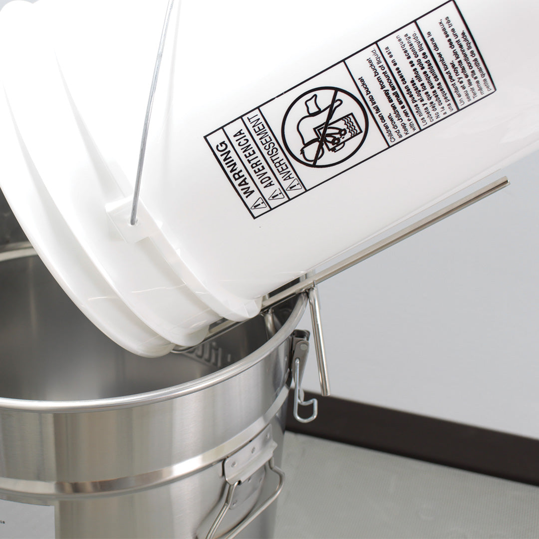 It sets neatly on a 5 gallon bucket, and holds another bucket tilted above for easy drainage.