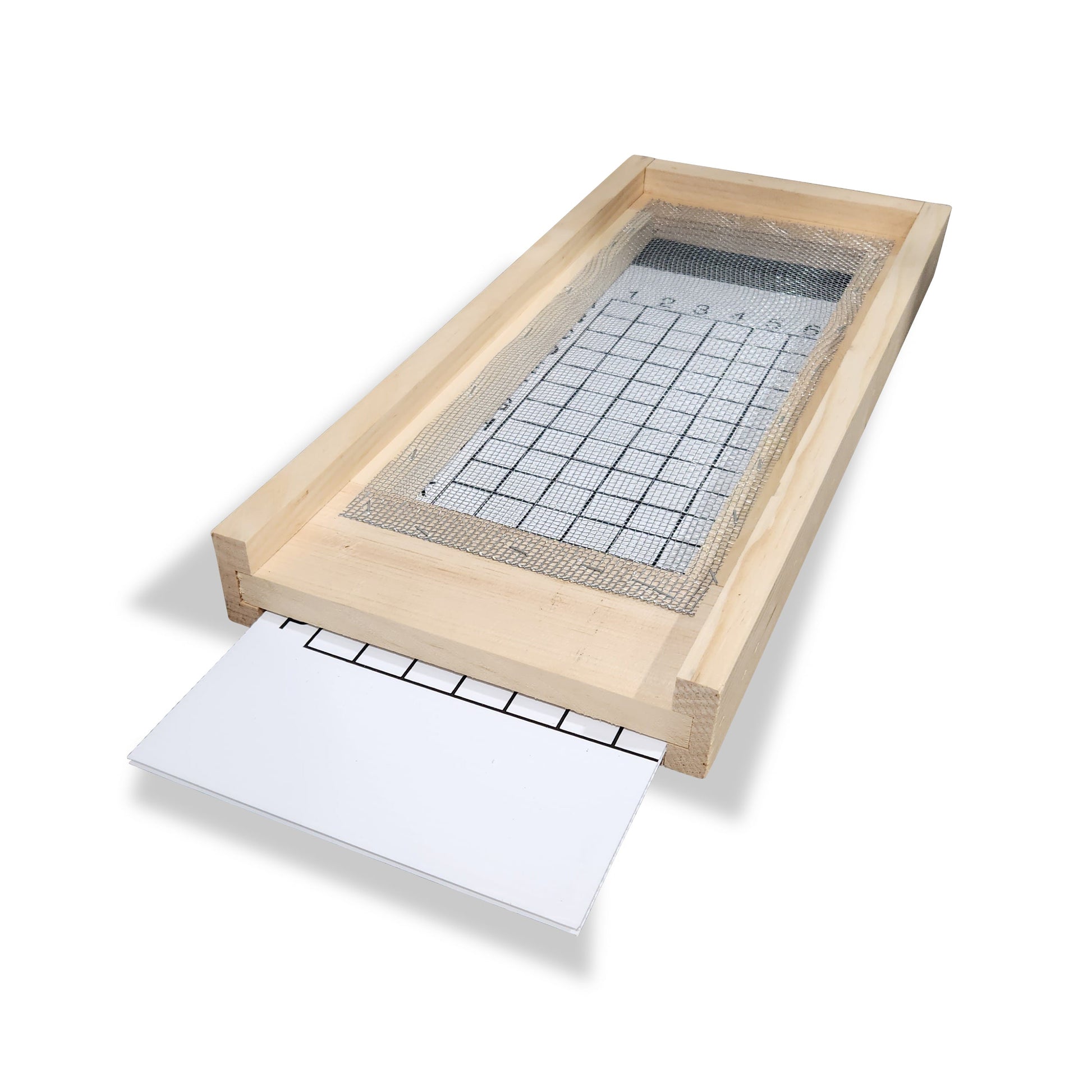 A corrugated filler board is included to slide underneath and close off the opening when desired. A grid chart is included to monitor mite fall if desired. Tip: spread cooking oil on the mite board to keep the mites in place.