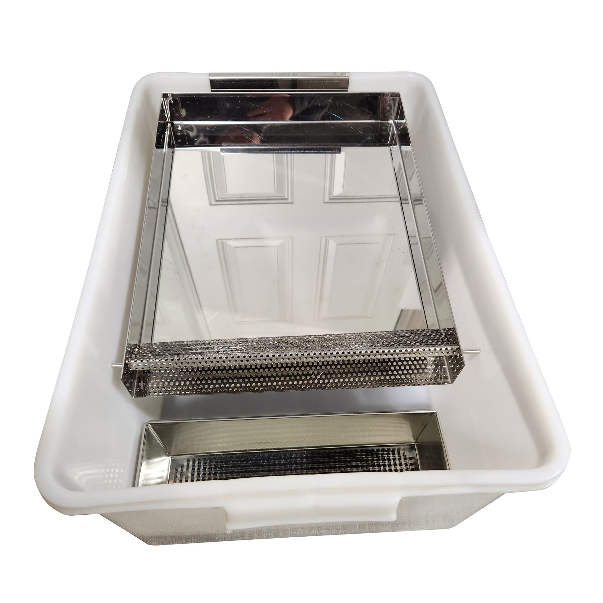 Simply scrape off and place old wax or comb into the tray, and the sun does the work for you! The wax collects in a small metal tray below.